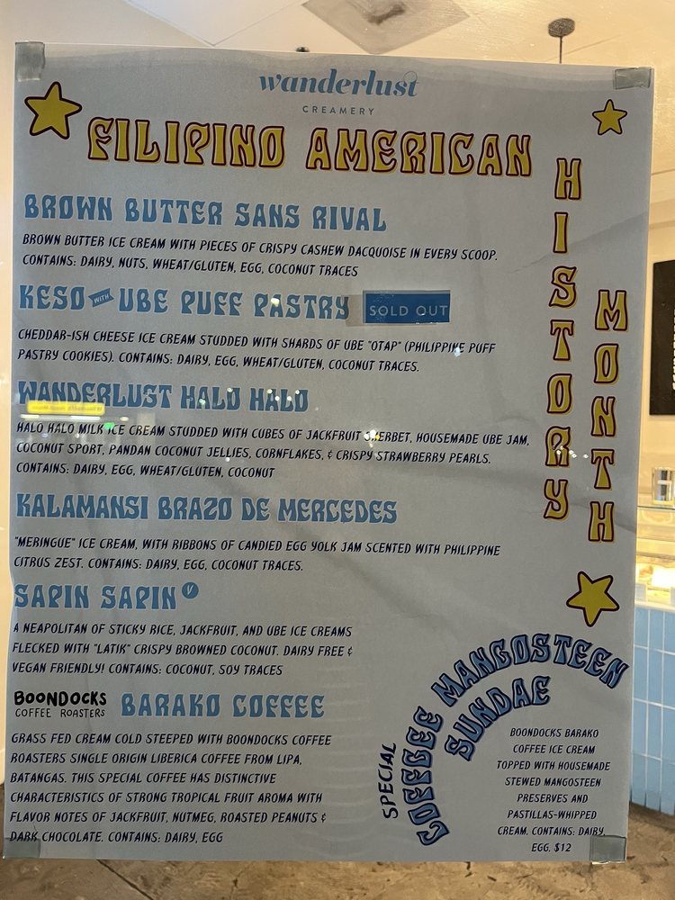 Wanderlust Creamery, located in Tarzana, CA, is a must-visit for ice cream enthusiasts seeking unique flavors. With seasonal monthly options like Nanaimo bar and pretzel, customers like Chau T. rave about the delicious offerings. The ube malt, a favorite of Geraldine C., showcases the spot-on ube flavor that keeps customers coming back. Wanderlust Creamery's Filipino American History Month specials like brown butter sans rival impress customers like Jen A. The shop's cozy atmosphere and helpful staff, noted by Crystal V., make the experience even more enjoyable.